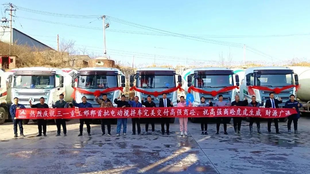 河北邯郸,晴空万里。31台崭新的三一电动搅拌车整装待发,共赴春天之约。