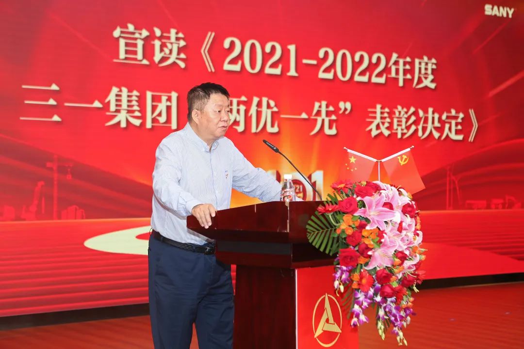 2021年,三一集团各级党组织和广大党员发扬党员先锋模范作用,抢抓机遇、团结奋进,全力推进公司高质量发展,涌现出一大批先进典型。袁金华宣读《2021-2022年度三一集团“两优一先”表彰决定》。