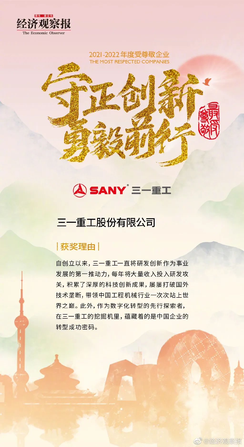 近日,经济观察报2021-2022年度中国最受尊敬企业线上峰会暨颁奖盛典举办,三一重工荣获“中国最受尊敬企业”称号。