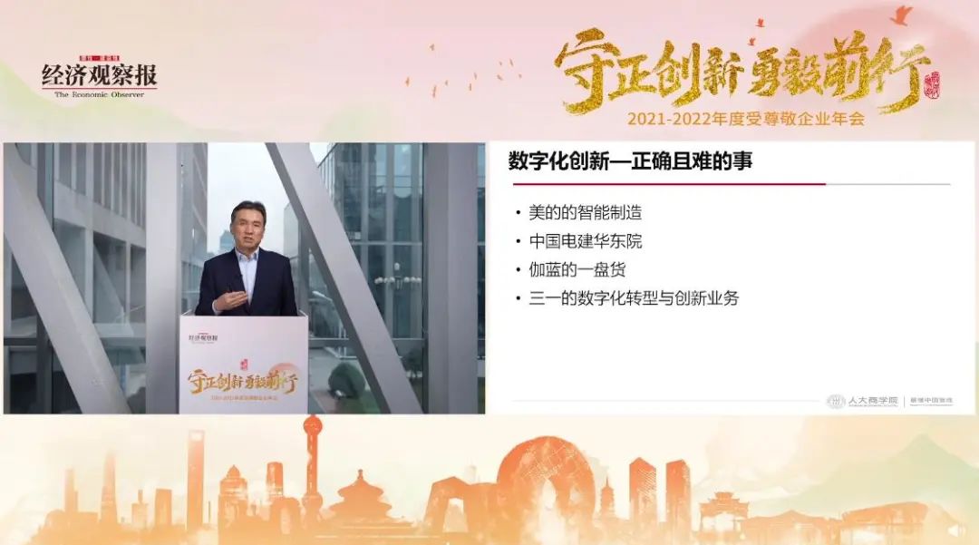 中国人民大学商学院原院长毛基业在盛典直播中也指出数字化创新是通往“受尊敬”的确定性路径,并讲述了三一的数字化转型与创新业务案例。