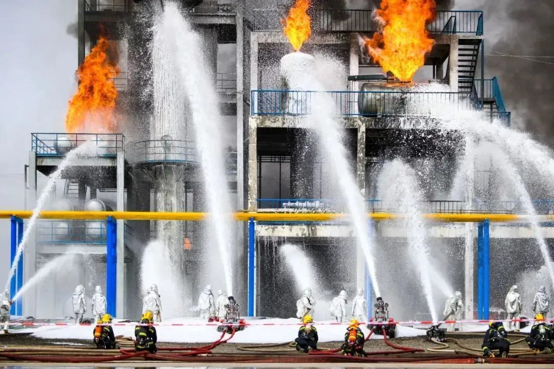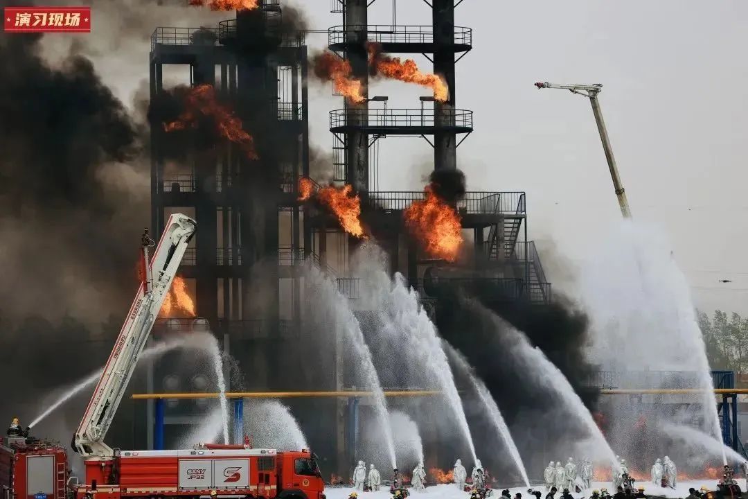 演习中,消防战士操作48米大跨度消防车进行油罐灭火,最大工作高度48米,最大工作幅度42.5米,相比常规高喷车高出3倍,成为全场焦点。