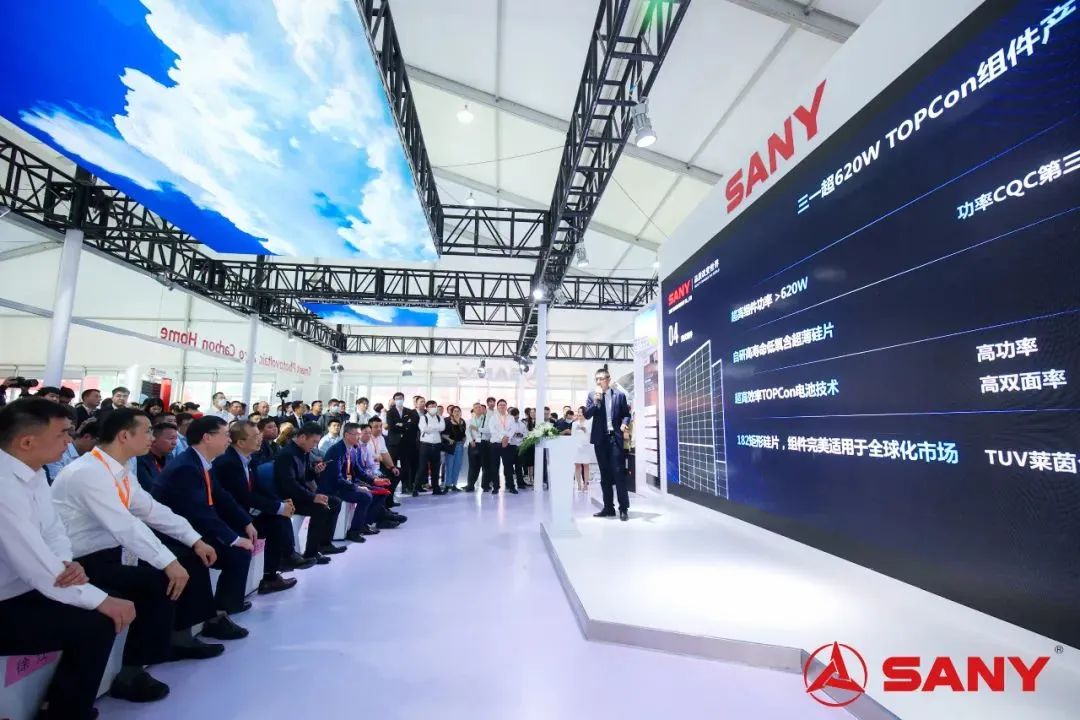 展会首日,三一硅能展厅举办新品发布会,正式对外揭开全新三一超620W TOPCon组件的神秘面纱,首次与公众见面。