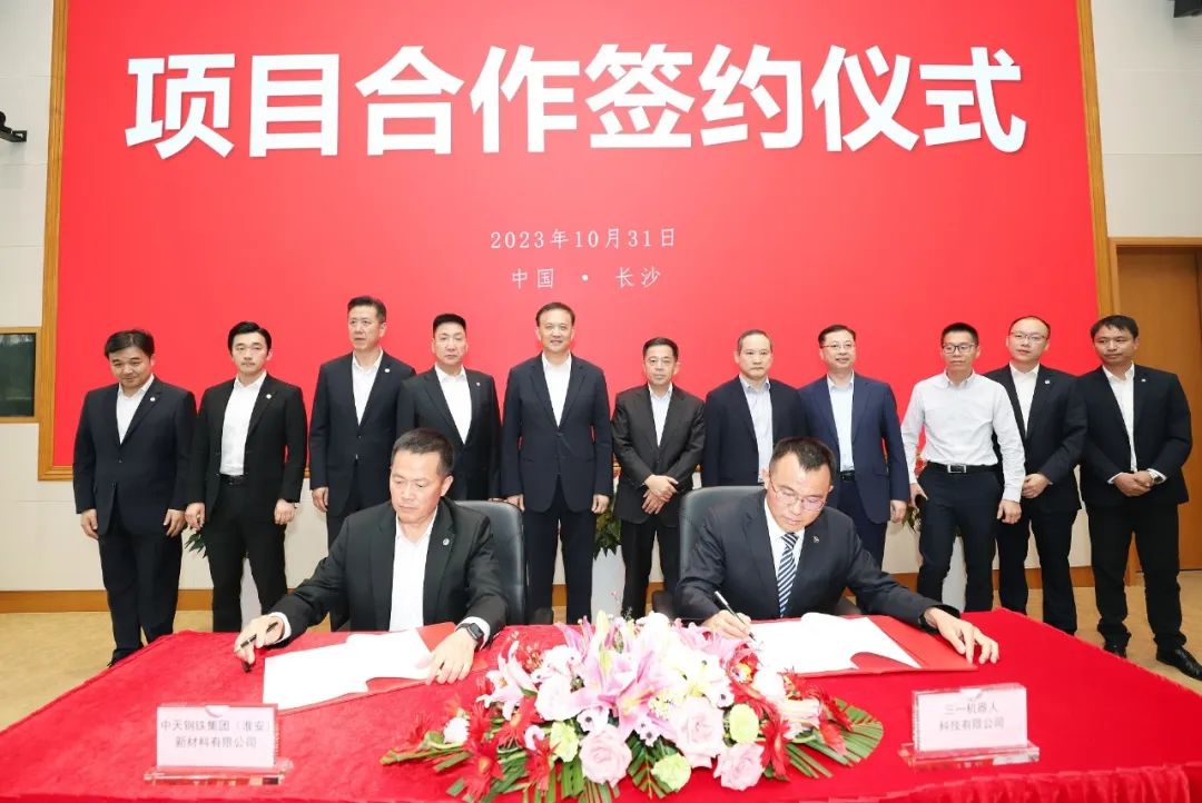 10月31日,三一集团与中天钢铁集团签署战略合作协议,三一机器人科技有限公司与中天钢铁集团(淮安)新材料有限公司签订超高强精品钢帘线整厂智能仓储物流自动化项目合同,合同总金额超1亿元人民币。