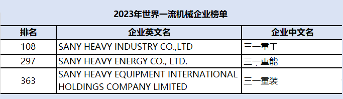 此次三一集团旗下三大上市公司齐齐荣登2023年世界一流机械企业榜单,是对三一集团经营业绩、研发创新、运营能力、影响力等综合竞争力的又一次高度肯定。
