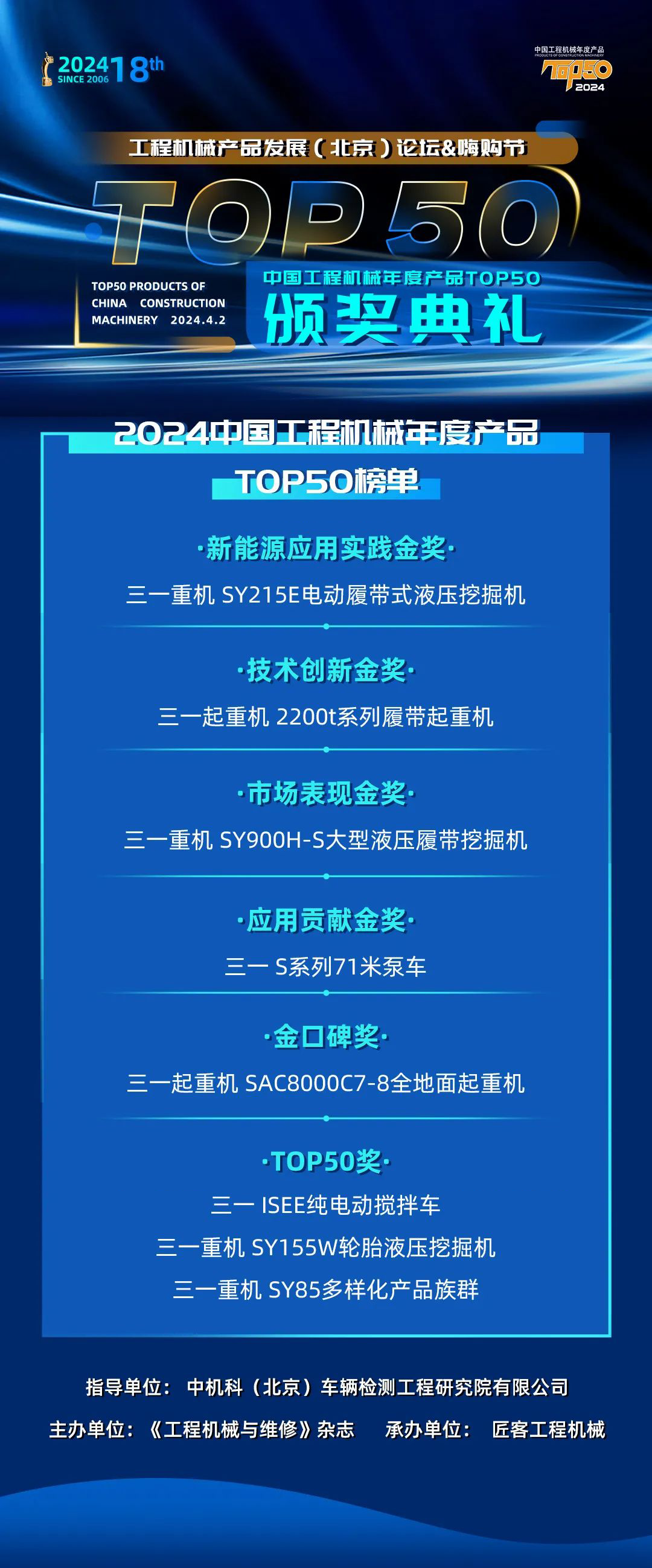 4月2日,由中机科(北京)车辆检测工程研究院有限公司指导,《工程机械与维修》杂志主办的“中国工程机械年度产品TOP50”颁奖典礼隆重举行,三一8款产品实力上榜,摘得新能源应用实践金奖、技术创新金奖、市场表现金奖、应用贡献金奖、金口碑奖等奖项,载誉而归。