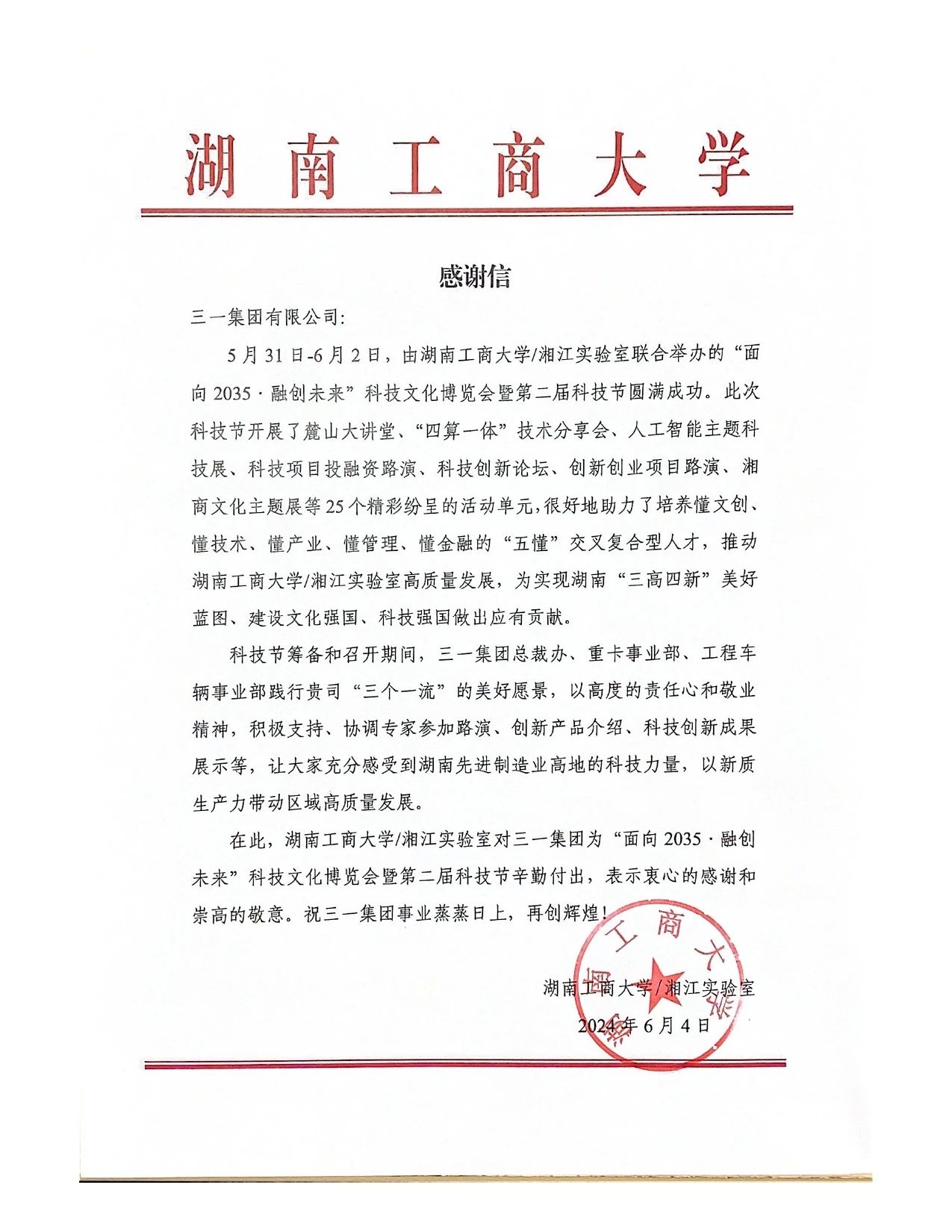 近日,三一集团收到湖南工商大学发来的感谢信,对三一集团积极参与“面向2035·融创未来”科技文化博览会暨第二节科技节给予了高度肯定与赞扬。