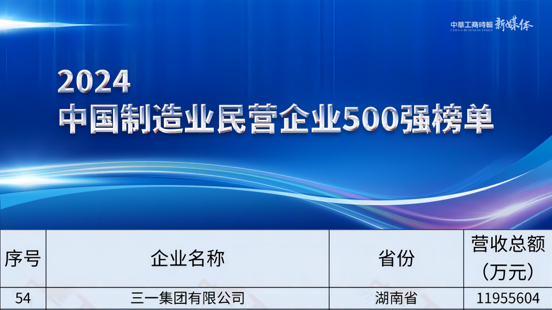 榜单显示,三一集团位列“2024中国民营企业500强”第81位,同时荣膺“2024中国制造业民营企业500强”第54位。