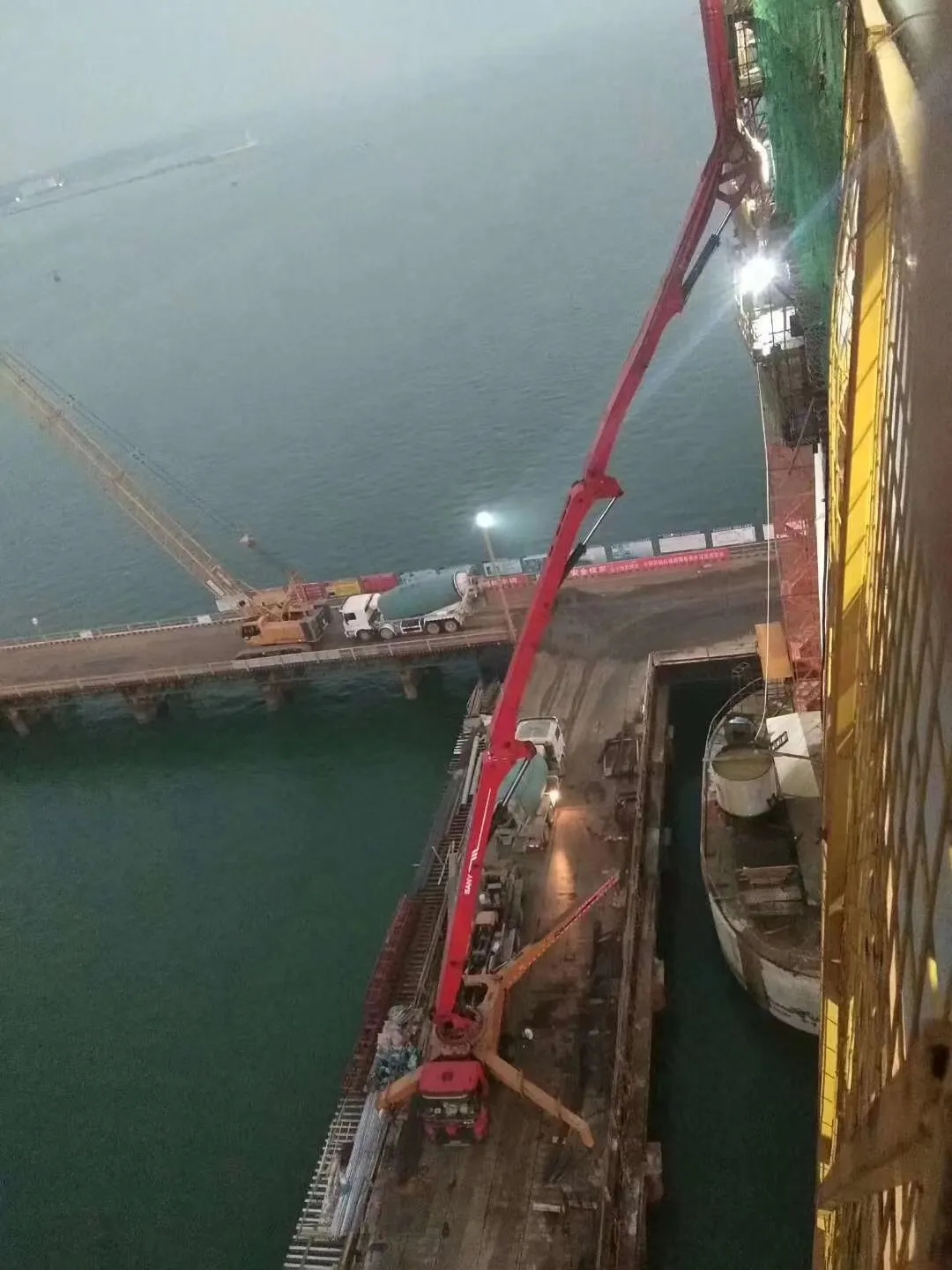 海上作业条件有限,栈桥只有9米宽,狭窄的作业区域为施工带来不小的挑战;同时海上风力强,钢铁栈桥在海水的冲击下晃动很大,对泵车稳定性提出了更高的要求,稍有不慎,就有可能坠入海中。经过三一工作人员和施工方多次探讨施工方案,最后决定在栈桥边打护筒,支腿架护筒上确保泵车的架泵位置,得以顺利施工,使得原定工期缩短近一个月。