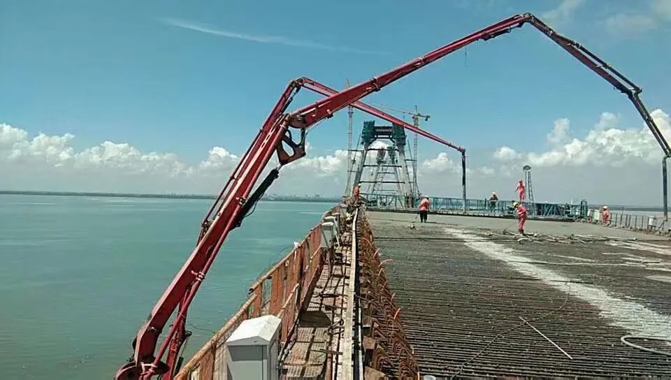 在桥面施工中,由两台三一泵车同时向上方大桥桥面不断泵送混泥土,超长臂架覆盖整个桥面,指哪打哪,不放过每一个角落,克服高空混泥土泵送和超宽桥面浇筑的问题。