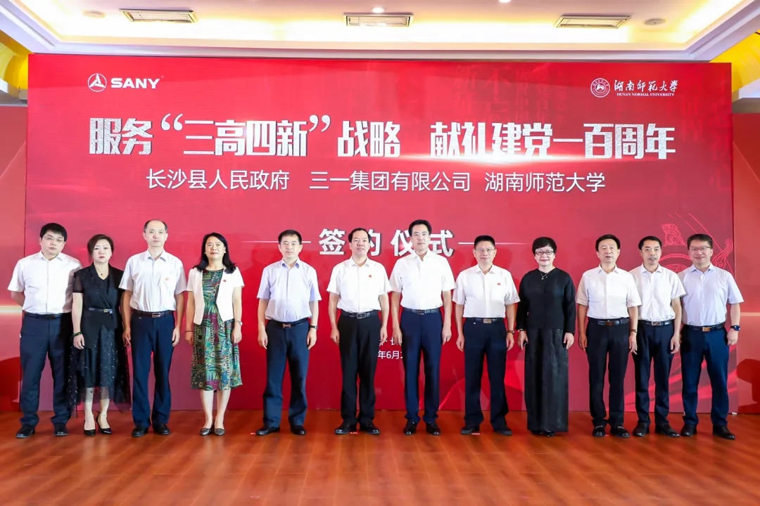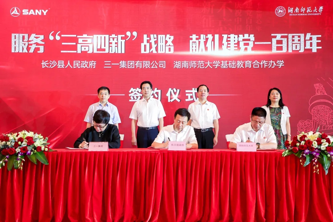 服务“三高四新”战略,献礼建党一百周年。6月28日,长沙县政府、三一集团、湖南师范大学合作签约仪式在三一长沙产业园隆重举行,三一集团将兴建两所“附中”和一所“学院”,助力更多学子成为国家栋梁之才。