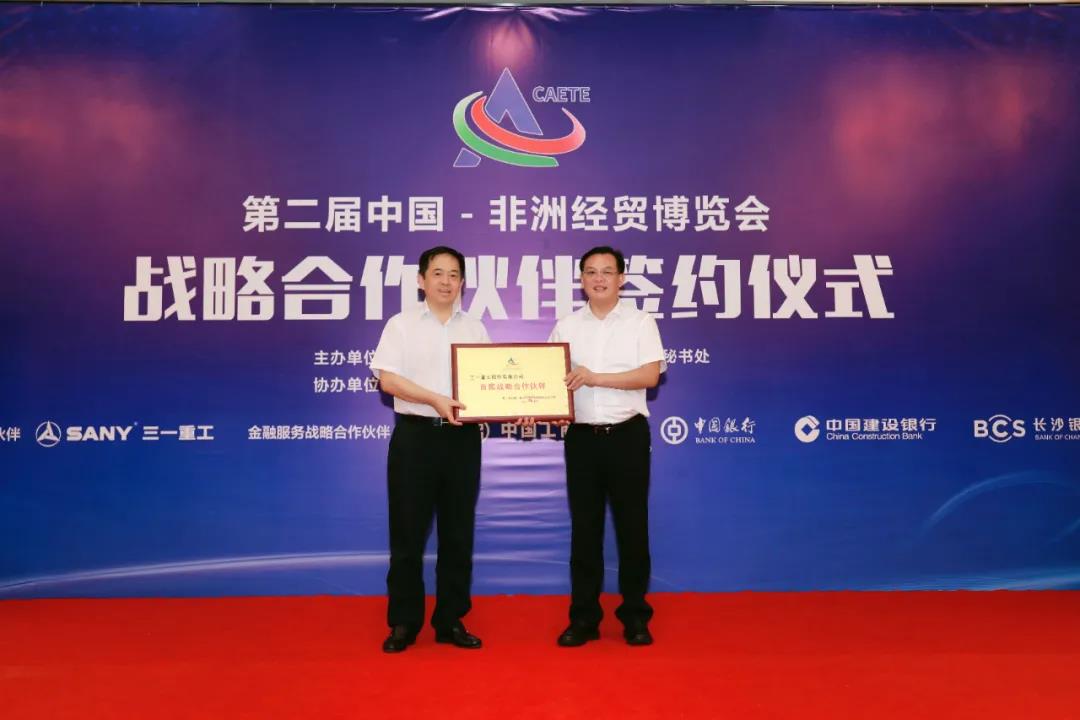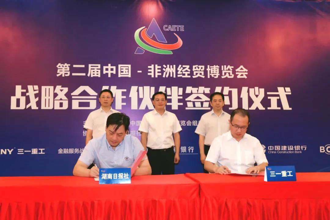 9月18日,第二届中非经贸博览会战略合作伙伴签约仪式在长沙举行。仪式现场,第二届中非经贸博览会组委会秘书处执行副秘书长、湖南省商务厅党组书记沈裕谋为本届博览会首席战略合作伙伴三一重工授牌,三一重工总裁向文波代表公司接牌。湖南日报社总编辑邹继红和三一重工高级副总经理陈静上台签约。这标志着三一重工正式成为第二届中非经贸博览会首席战略合作伙伴。