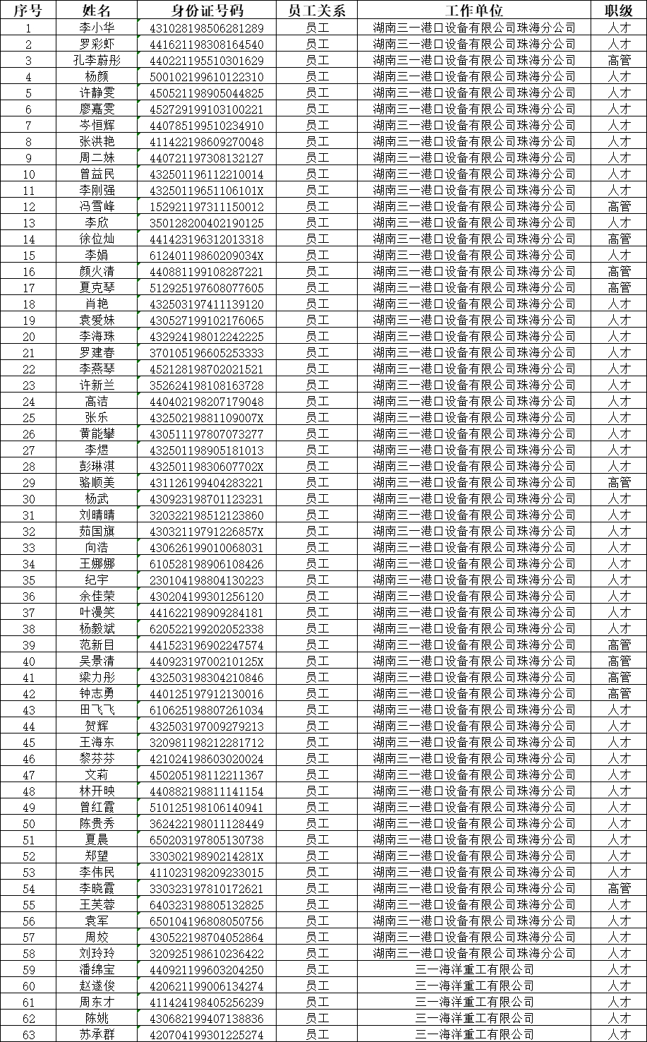 为增加员工归属感,我司开发位于珠海市金湾区平沙镇铭恩路31号【三一蓝海花园项目】用于引进行业人才,为保障房住不炒的居住用途及员工购房资格合规性,根据我司制定的《关于三一蓝海花园购房资格管理办法》,现对购房名单做如下公示: