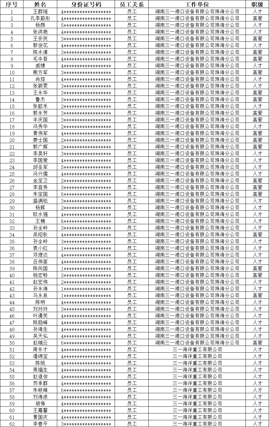 为增加员工归属感,我司开发位于珠海市金湾区平沙镇铭恩路31号【三一蓝海花园项目】用于引进行业人才,为保障房住不炒的居住用途及员工购房资格合规性,根据我司制定的《关于三一蓝海花园购房资格管理办法》,现对购房名单做如下公示: