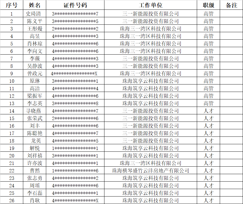 为增加员工归属感,我司开发位于珠海市金湾区平沙镇铭恩路31号【三一蓝海花园项目】用于引进行业人才,为保障房住不炒的居住用途及员工购房资格合规性,根据我司制定的《关于三一蓝海花园购房资格管理办法》,现对购房名单做如下公示: