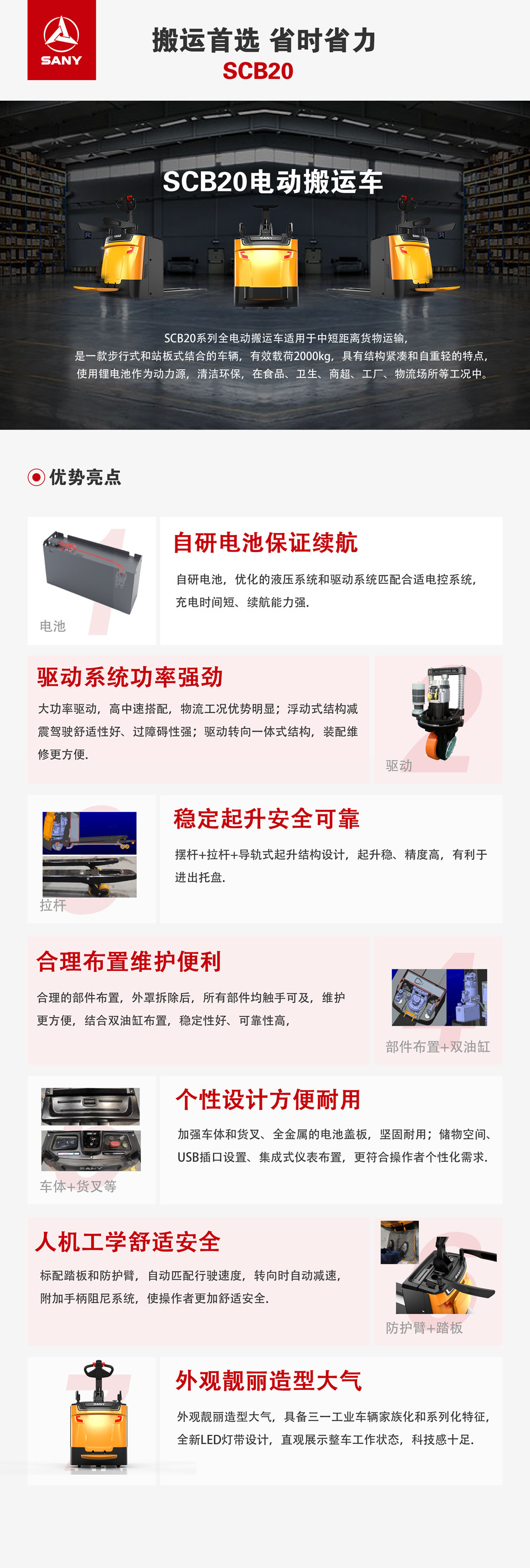 自研的电池,优化的液压系统和驱动系统匹配合适的电控系统,能够做到低能耗,较同行降低10%以上; 大容量锂电池,续航能力更强,大功率充电器,充电时间最短1.5小时; 功率强劲的驱动系统,可选两档速度,高中搭配,适合大多数搬运场合,尤其在物流工况优势更为明显; 多储物空间、USB插口设置,更符合操作者个性化需求;